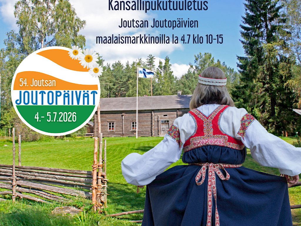 Joutsan Joutopäivillä tuuletetaan kansallispukuja lauantaina 4.7. klo 10-15! Joutsan Joutopäivien maalaismarkkinoilla tuuletetaan tänä vuonna kansallispukuja. Joutsan talomuseon idyllinen miljöö onkin kuin tehty kansallispuvussa keimailua varten. Kansallispuvun tuuletuksen ohessa voit nauttia ohjelmallisten maalaismarkkinoiden tunnelmasta. Markkinoilla on myynnissä monipuolisia tuotteita sekä ruokaa, makkaraa, kahvia ja lettuja.