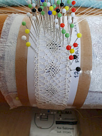 Harjoituspitsinä nyplätään kapeaa viuhkareunaista pitsiä, jota vastaavaa käytetään muutamien